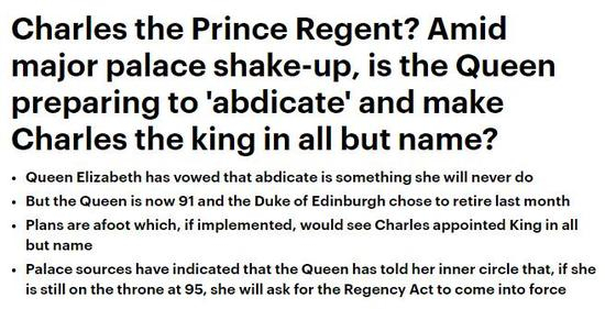 《每日邮报》:查尔斯要当摄政王?英国王室有大动作,女王“退位”,让查尔斯掌握实权?