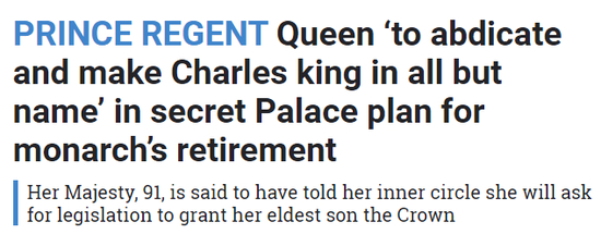 事实上,随着女王年事渐长,近几年频频传出“被”退位的消息。有关查尔斯王子摄政的消息2014年就有媒体报道过: