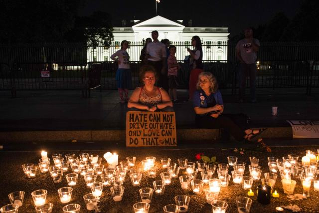 8月13日,在美国华盛顿白宫前,人们参加为暴力事件受害者举行的守夜活动。(新华社/法新) 非政府组织“南方贫困问题法律中心”2017年研究报告数据显示,2016年美国的仇恨组织(大多针对种族、宗教、性别等)比上一年增加25个,达到917个,其中白人种族主义团体如三K党、白人民族主义团体占了六成以上。