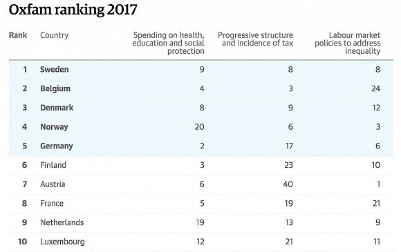 乐施会和国际金融发展(Development Finance International)从税收、在医疗和教育等领域的社会开支以及工人权利三个政策领域,历时一年,为全球各国在致力于解决不平等上做出的努力做了个排名。