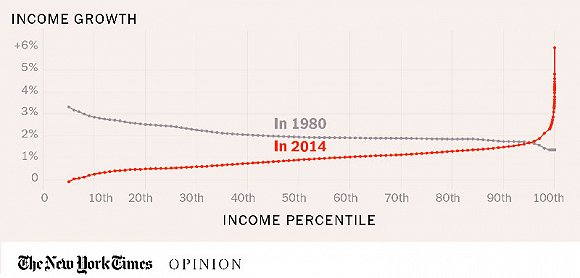 基于著名经济学家托马斯·皮凯蒂、伊曼纽尔·赛斯和加布里埃尔·祖克曼最新测算数据,《纽约时报》专栏作家大卫·莱昂哈特制作了一个图表,显示美国穷人和中产阶级的收入增幅,惊人地落后于0.001%最富裕的人群。