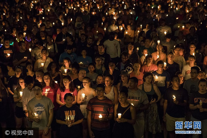 当地时间2017年8月16日,美国弗吉尼亚州夏洛茨维尔,数千人手捧蜡烛沿此前“白人至上”集会路线游行,抗议“白人至上主义”。图片来源:视觉中国
