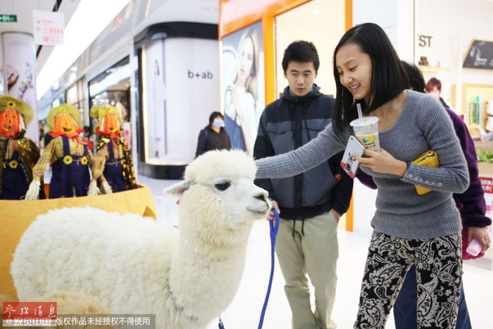 2015年10月22日,北京,为了提前营造万圣节氛围,羊驼、迷你香猪等众多萌宠入驻北京某大型商场,吸引众多顾客的眼球。图为游客近距离抚摸羊驼。