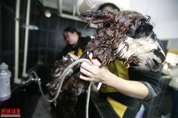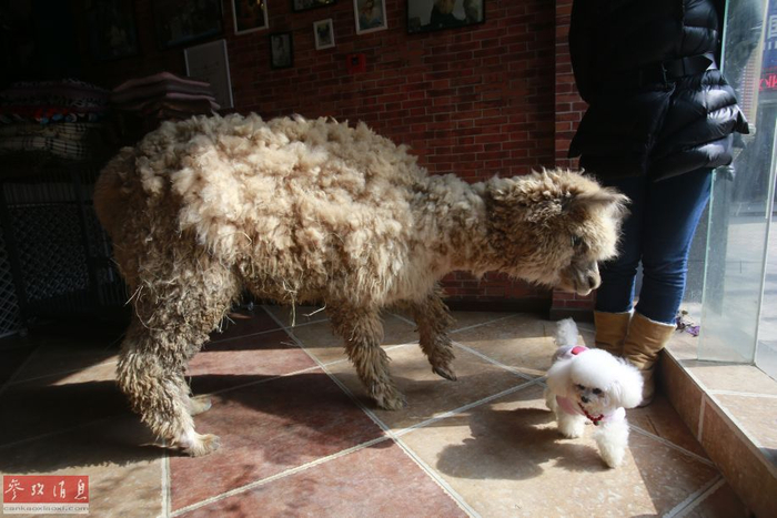 2015年01月19日,来自武汉东湖海洋世界的5只羊驼被送到武昌一家宠物造型店进行“洗剪吹”造型。(图片来源:CFP图片,版权作品 请勿转载)