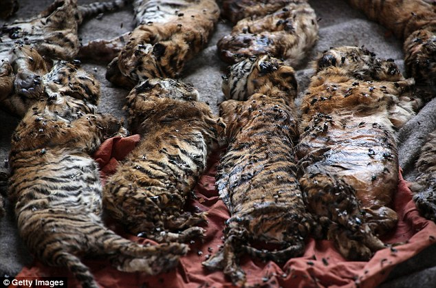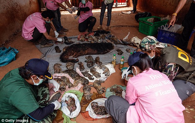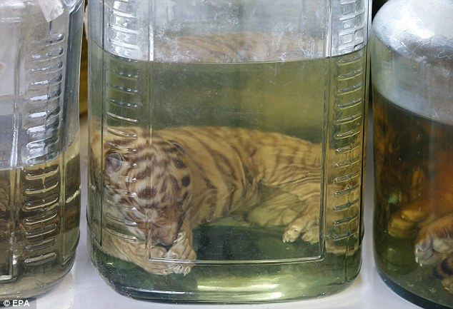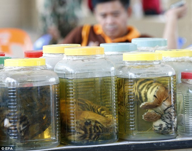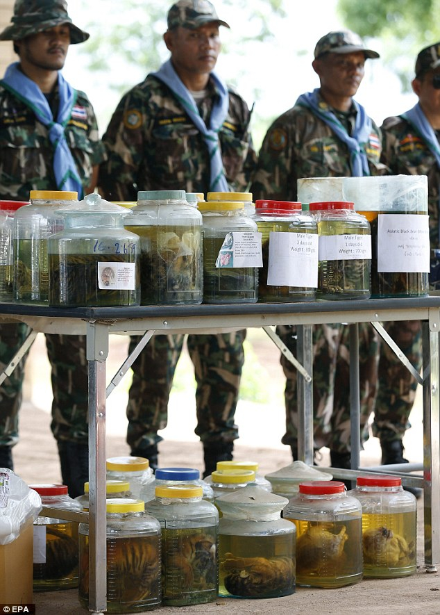 泰国国家公园及动植物保护厅3日下午召开记者会,现场展示日前从庙中搜查出来的30多个瓶罐,里面装的大多是虎骨、虎鞭和虎皮等,还有一些熊和豹子的器官及鹿茸。有的罐上贴有标签,标注着内装物为出生数天的老虎宝宝。