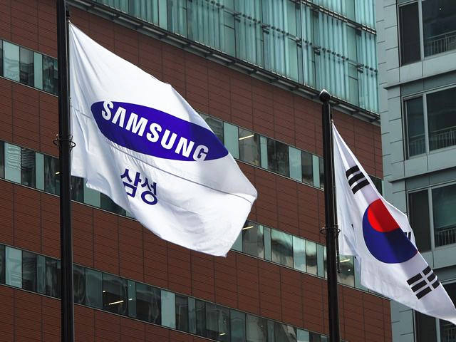 首尔,韩国国旗(右)与三星旗帜飘扬在三星公司一栋办公楼前。(新华/法新)