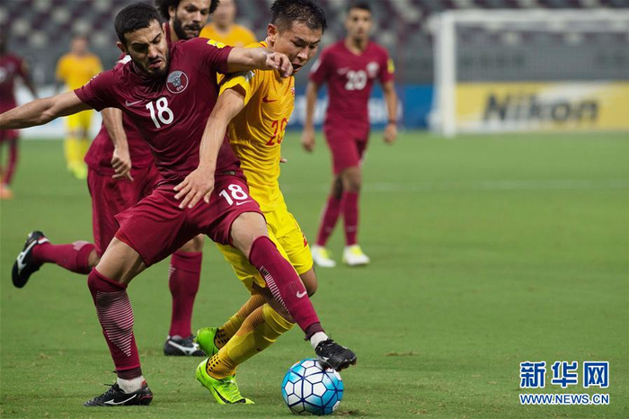 9月5日,中国队球员于汉超(前右)与卡塔尔队球员阿里-阿尔(前左)在比赛中拼抢。当日,在卡塔尔首都多哈进行的2018年世界杯足球赛亚洲区预选赛中,中国队以2比1战胜卡塔尔队。 新华社记者孟涛摄