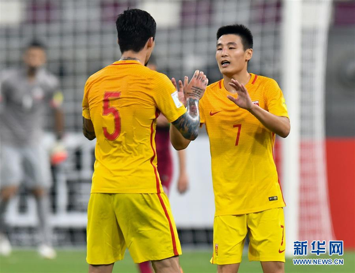 9月5日,中国队球员武磊(右)进球后与队友张琳芃庆祝。当日,在卡塔尔首都多哈进行的2018年世界杯足球赛亚洲区预选赛中,中国队以2比1战胜卡塔尔队。 新华社发(尼库摄)