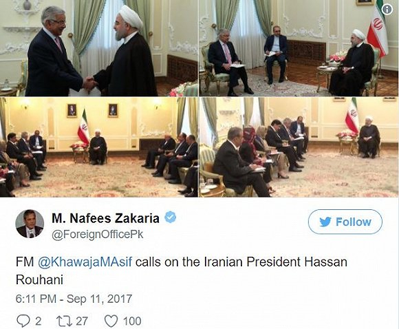 知情官员透露,在阿西夫与伊朗总统鲁哈尼会面时,鲁哈尼称在阿富汗内战问题上,伊朗与巴基斯坦的立场一致,认为只有通过政治对话和地区力量才能解决;伊朗也准备好就恢复阿富汗和平与巴基斯坦合作。