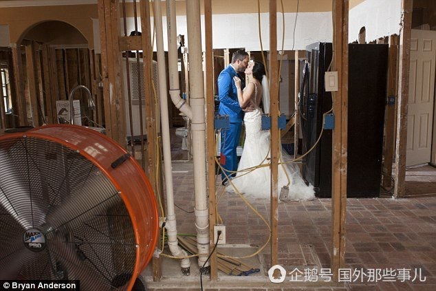 洪水后两人的第一件事情,就是帮助朋友家清理五英尺的深的积水。这也激发了他们想把婚礼做成一件大事情的想法,他们在那户人家拍摄了婚纱照。Shellie 说:" 任何婚宴都会被遗忘,但是照片永远能够留在你的记忆中。"