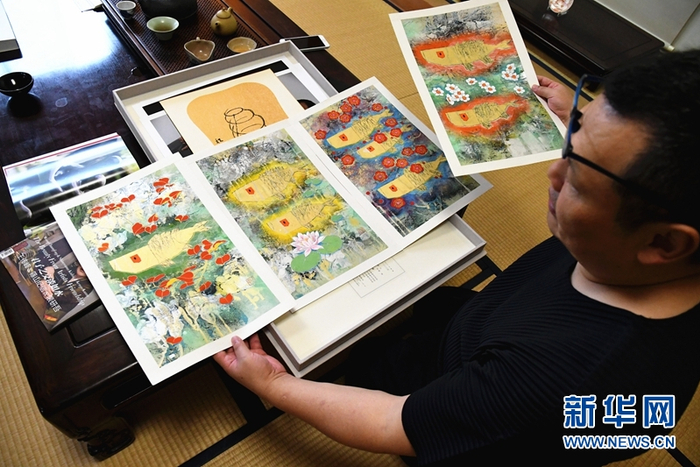 王传峰展示为中日和平友好条约缔结30周年创作的纪念邮票原版作品。新华网记者华义摄