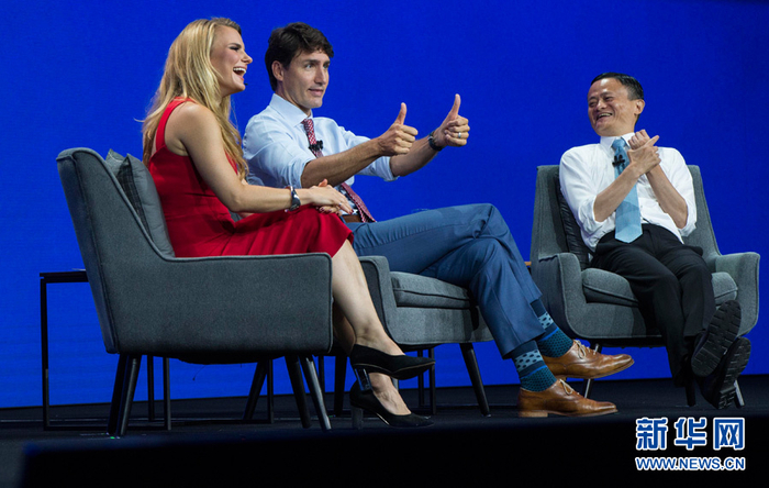 9月25日,特鲁多与马云举行对话,两人幽默风趣,不时引起全场笑声。新华网发 (邹峥摄)