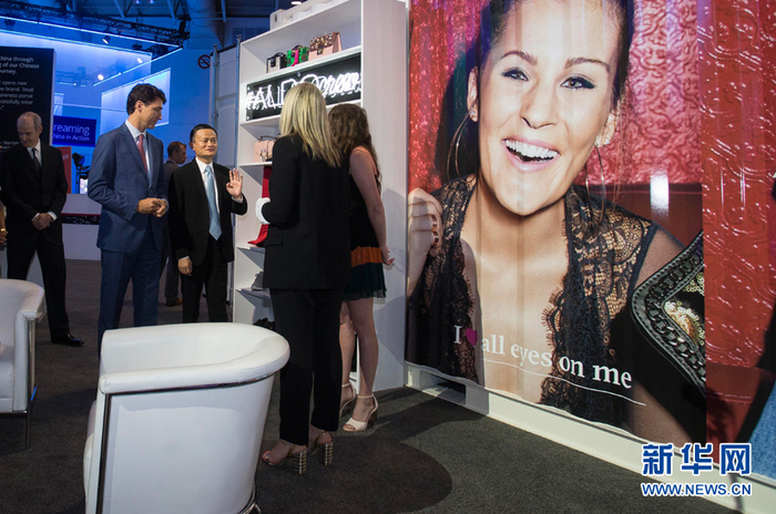 9月25日,在加拿大多伦多的国家会展中心,加拿大总理贾斯廷•特鲁多(左二)与阿里巴巴集团董事局主席马云参观阿里巴巴加拿大中小企业论坛上的商品展。新华网发 (邹峥摄)