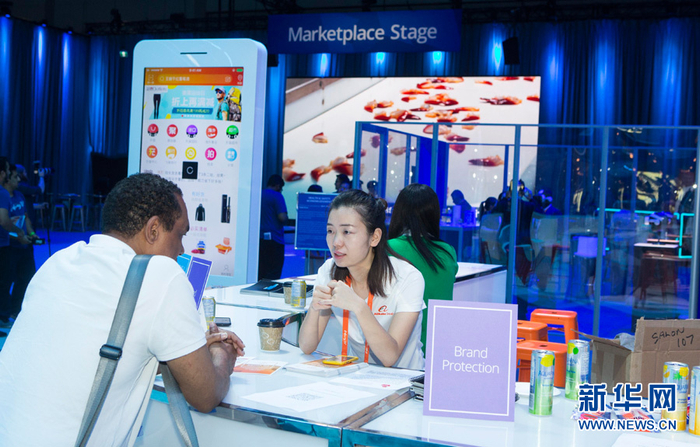 9月25日,在加拿大多伦多的国家会展中心,一位与会者(左)在阿里巴巴加拿大中小企业论坛上的展示区进行咨询。新华网发 (邹峥摄)