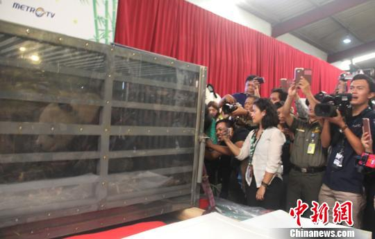28日,来自中国四川的国宝大熊猫“彩陶”与“湖春”抵达印尼,它们将在隔离观察一段时间后对印尼公众开放。中印尼两国将正式开始为期10年的大熊猫保护合作研究。图为大熊猫进场,全场嗨翻。 林永传 摄