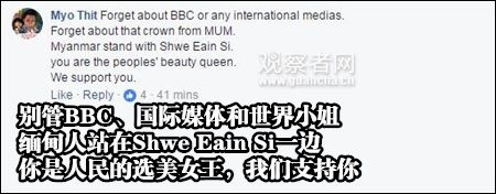 “是的,Shwe Eain Si制作了一段关于在若开邦武装分子传播恐怖统治的视频,这对她成为一名选美小姐的形象有害。作为缅甸公民,她应该利用自己的名望去说出这个国家发生的真相。”