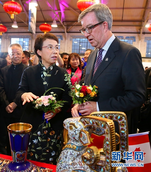 10月4日,北京市副市长程红向渥太华市长万晋思介绍中国工艺品。新华网发