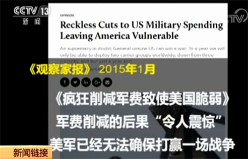 《观察家报》更是以《疯狂削减军费致使美国脆弱》为题声称,美军军费削减的后果“令人震惊”,军队无法维持运转,武器老旧,甚至老兵的福利都无法保证,评论称,美军已经无法确保打赢一场战争。
