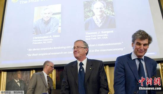 资料图:2011年10月10日,诺贝尔奖评选委员会宣布,美国经济学家托马斯·萨金特 Thomas J Sargent与克里斯托弗·西姆斯教授 Christopher A. Sims共同获得2011年度诺贝尔经济学奖。