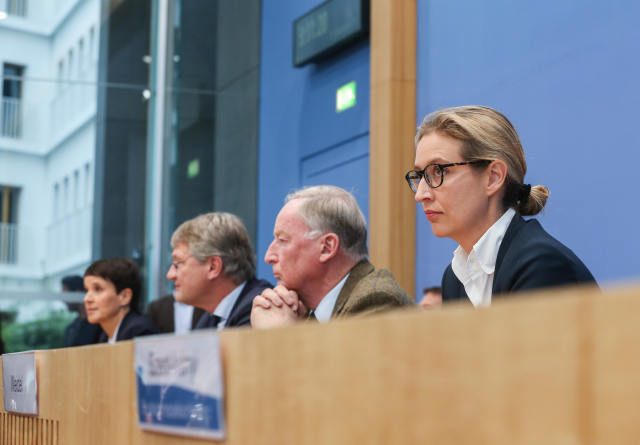 9月25日,在德国首都柏林,德国选择党联邦发言人莫伊滕(右四)、大选候选人高兰(右三)和魏德尔(右二)出席新闻发布会。(新华社记者单宇琦摄)