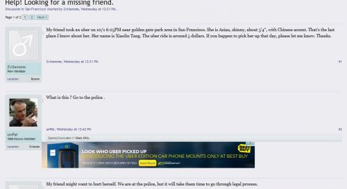 图为自称是唐晓琳朋友的网友在Uber司机论坛上登出的寻人启事信息。