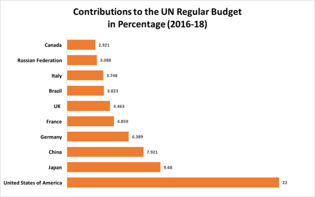 目前(2016-2018年),美国向联合国缴纳的会费占该机构总会费收入的22%,日本是9.68%,中国是7.92%。