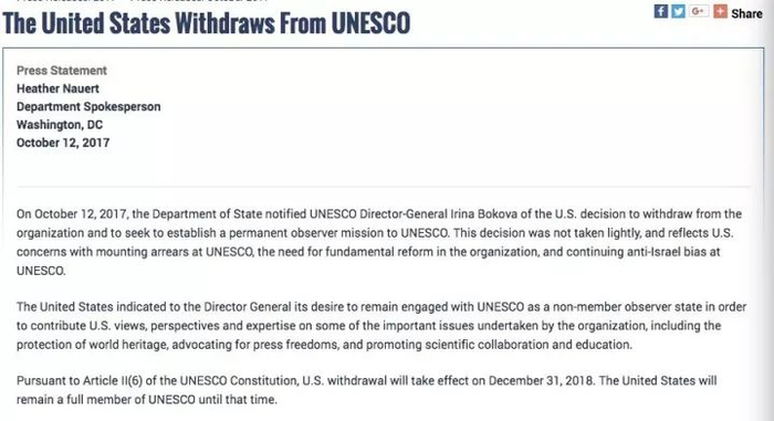 昨天,美国宣布从联合国教科文组织(UNESCO)任性“退群”了。