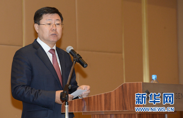 10月17日,在乌兹别克斯坦首都塔什干哈亚特酒店,中国驻乌兹别克斯坦大使孙立杰在南航2017年塔什干国际航线推介会上讲话。新华网记者沙达提摄