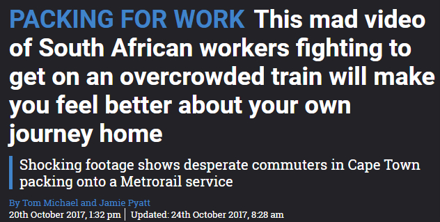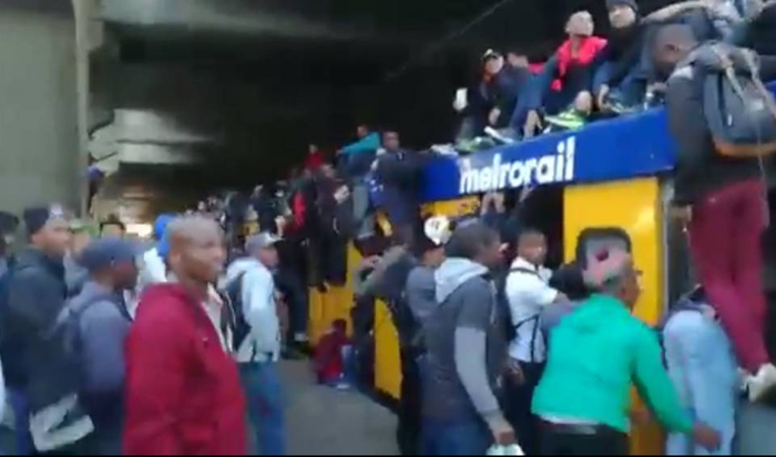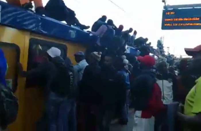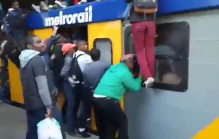 据说这事发生在南非第二大城市开普敦,当地人为了挤地铁上班,挂满了列车上面和两侧。