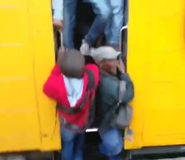 还有一些人爬上火车车顶,钻进车厢之间的空隙,强行破窗而入。