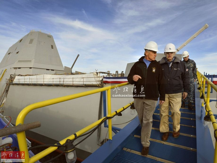 美国海军作战部长视察即将下水的DDG-1000,注意此时两座AGS炮塔均处于发射状态,主炮均已升起。