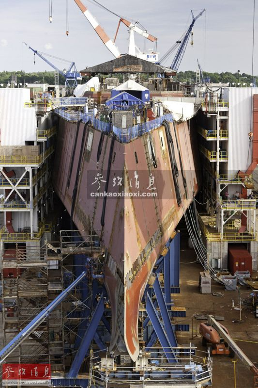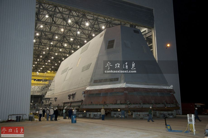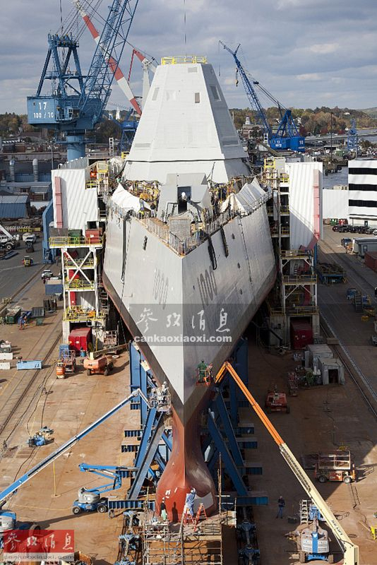 图为即将准备下水的DDG-1000,此时AGS和舰岛模块均已就位,舰体灰色海军涂装和1000的舷号也已刷好。如同剑锋一般的穿浪舰艏十分引人注目。