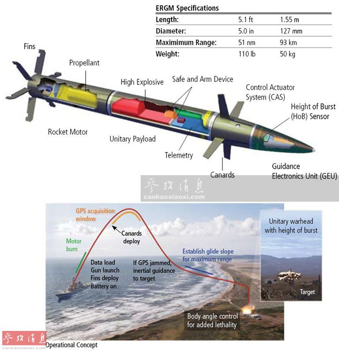 AGS所使用的另一种次口径(127毫米)远程制导炮弹称为ERGM,最大射程93千米,采用“GPS+惯性导航”复合制导,一旦GPS卫星无法使用可以迅速切换制导方式,下小图可看到ERGM的攻击弹道,弹上可控鸭翼可确保炮弹以90度直角俯冲命中目标,并在预定高度引爆空爆弹头,以取得最佳毁伤效果。