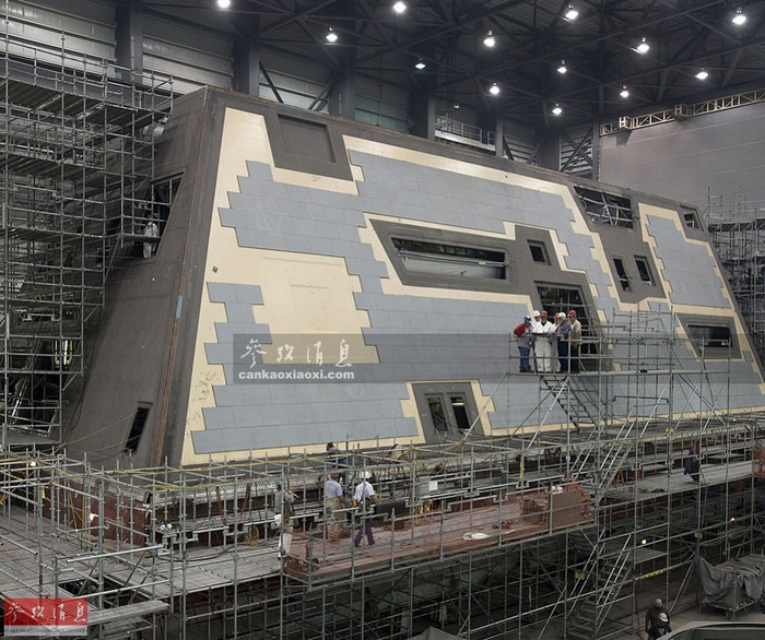 作为美海军打造的最新一代水面战舰,DDG-1000在建造时也采用了流行的模块式分段建造法。图为正在铺设雷达吸波材料的DDG-1000舰岛,可见为多波段一体化相控阵雷达和各种天线预留的空位,还未安装。