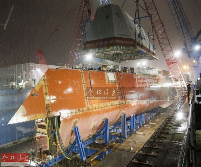 图为2014年11月,朱姆沃尔特级2号舰“蒙苏尔”号(DDG-1001)在风雪中吊装舰岛模块。