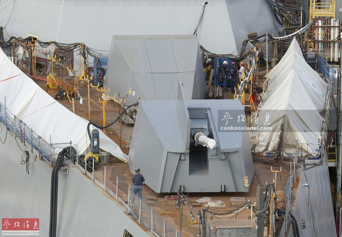 正在进行调试作业的155毫米“先进舰炮系统”(AGS)隐身舰炮,前座炮塔呈发射状态,后座炮塔呈收纳状态。