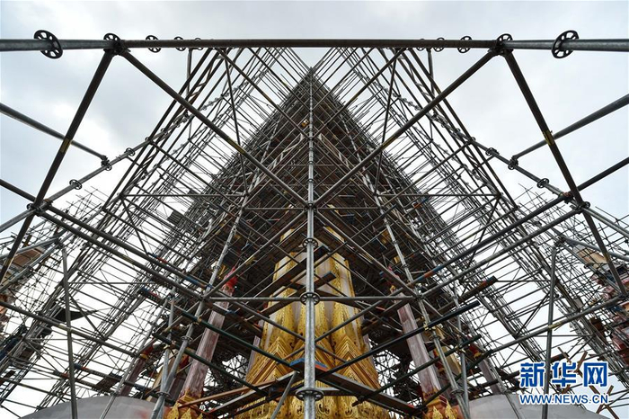 8月8日,在泰国曼谷,工人们在普密蓬国王遗体火化台建设工地的脚手架上施工。泰国将于2017年10月25日至29日为已故国王普密蓬·阿杜德举行葬礼。在为期五天的葬礼中,普密蓬国王遗体将于2017年10月26日在曼谷王家田广场上修建的火化台进行火化。普密蓬国王遗体火化台于2017年1月动工修建,计划于9月完工。新华社记者 李芒茫 摄
