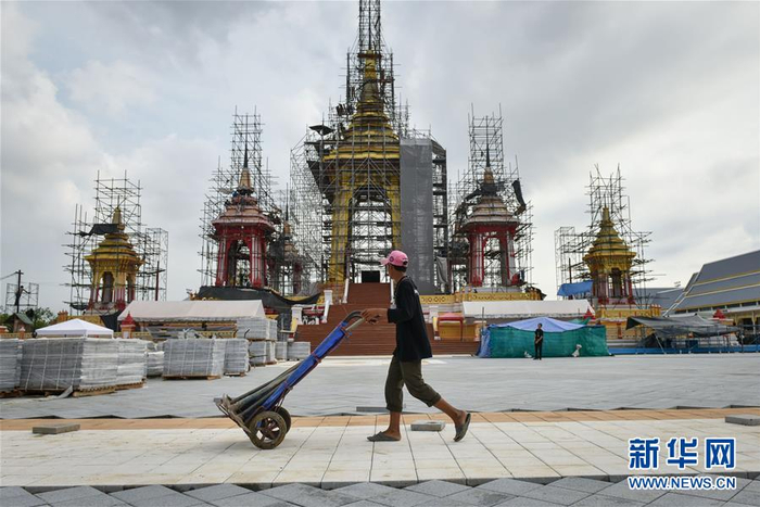 8月8日,在泰国曼谷,一名工人走过修建中的普密蓬国王遗体火化台。泰国将于2017年10月25日至29日为已故国王普密蓬·阿杜德举行葬礼。在为期五天的葬礼中,普密蓬国王遗体将于2017年10月26日在曼谷王家田广场上修建的火化台进行火化。普密蓬国王遗体火化台于2017年1月动工修建,计划于9月完工。新华社记者 李芒茫 摄