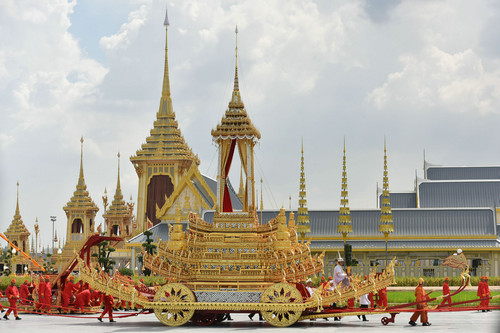 资料图片:10月26日,在泰国曼谷,工作人员护送泰国先王普密蓬的遗体前往火化台。新华社记者 李芒茫 摄