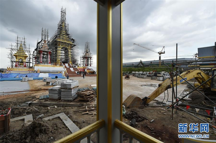 这是8月8日在泰国曼谷拍摄的普密蓬国王遗体火化台施工现场。泰国将于2017年10月25日至29日为已故国王普密蓬·阿杜德举行葬礼。在为期五天的葬礼中,普密蓬国王遗体将于2017年10月26日在曼谷王家田广场上修建的火化台进行火化。普密蓬国王遗体火化台于2017年1月动工修建,计划于9月完工。新华社记者 李芒茫 摄