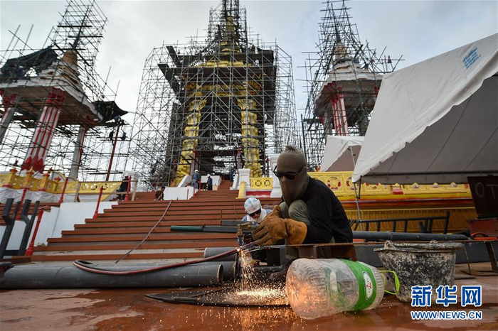 8月8日,在泰国曼谷,一名工人在普密蓬国王遗体火化台建设工地进行电焊作业。泰国将于2017年10月25日至29日为已故国王普密蓬·阿杜德举行葬礼。在为期五天的葬礼中,普密蓬国王遗体将于2017年10月26日在曼谷王家田广场上修建的火化台进行火化。普密蓬国王遗体火化台于2017年1月动工修建,计划于9月完工。新华社记者 李芒茫 摄