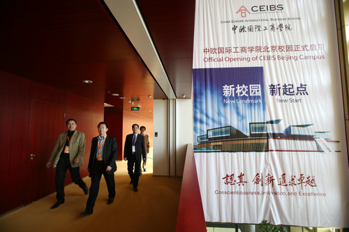 资料图片:2010年4月24日,几名曾在中欧国际工商学院进修过EMBA课程的老学员在新校园主楼内参观。新华社记者 侯俊 摄