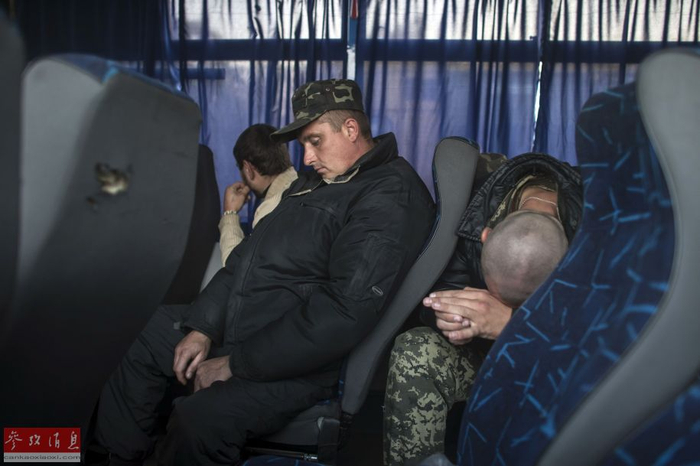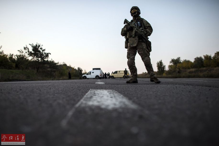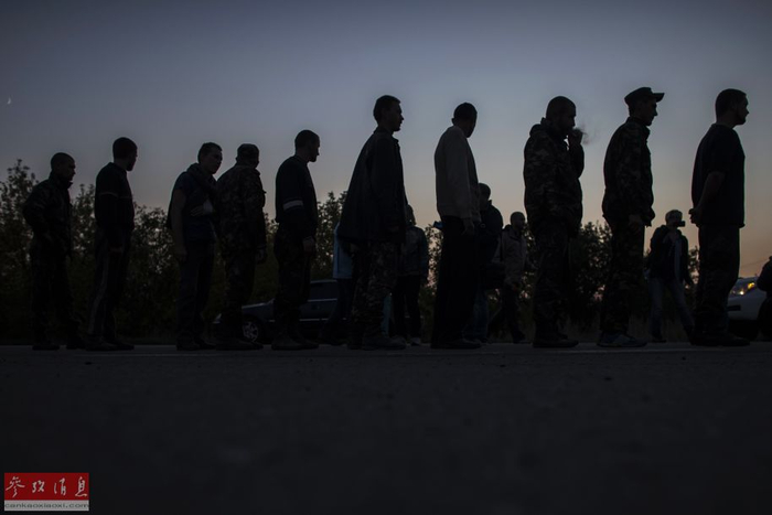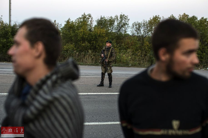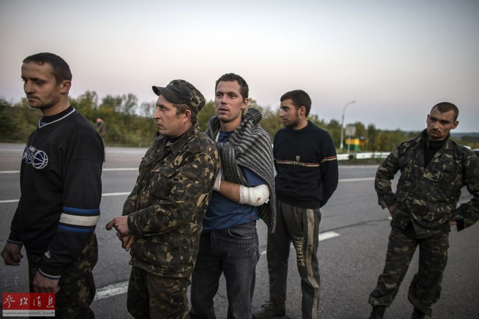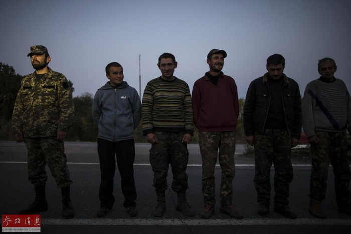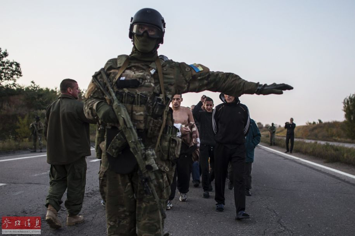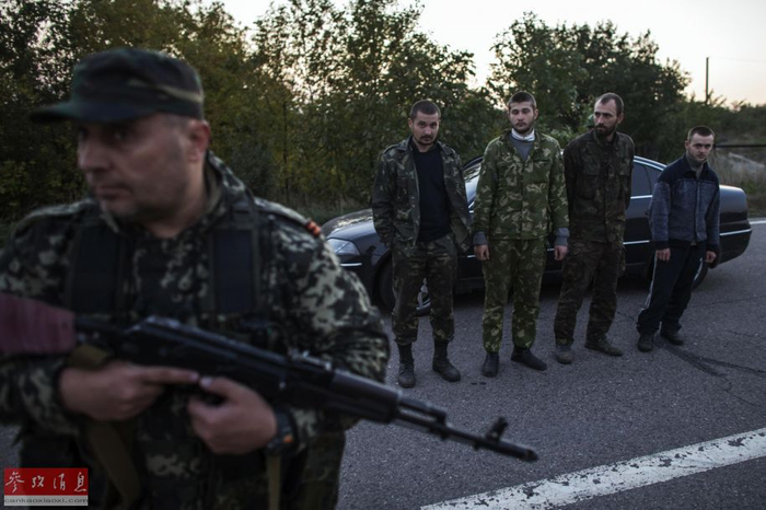当地时间2014年9月28日,顿涅茨克附近,乌克兰政府军与民间武装互相交换俘虏,乌克兰士兵守卫在成为俘虏的民间武装人员旁。