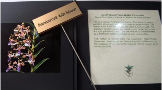以施泰因迈尔总统姓名命名的石斛花。植物园中还有一株以德国总理安格拉•默克尔姓名命名的兰花,但暂未开花。