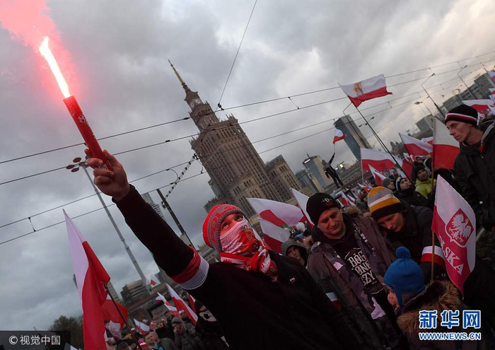 当地时间2017年11月11日,波兰华沙,民众举行大规模游行,纪念国家独立日和一战结束。 波兰华沙举行大游行庆祝独立日(图片来源:视觉中国)