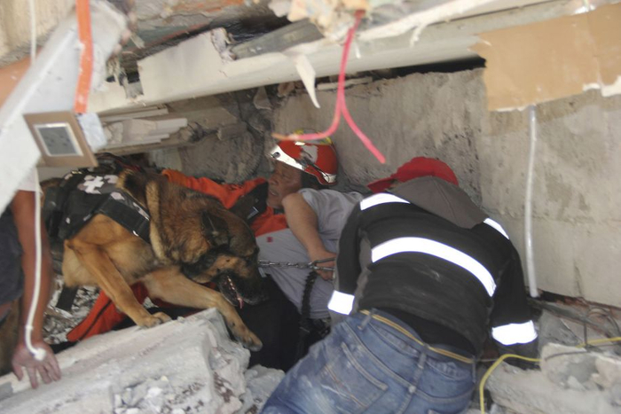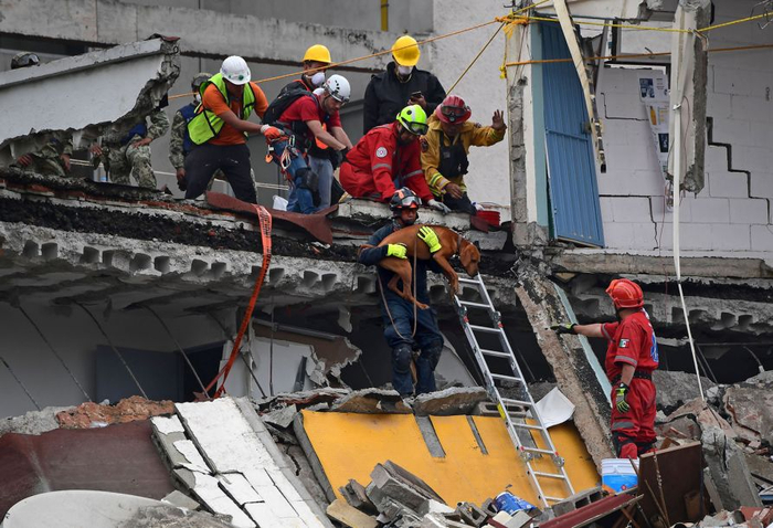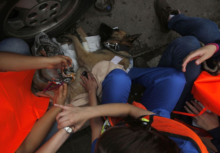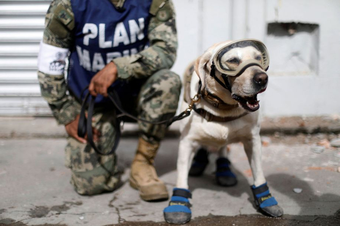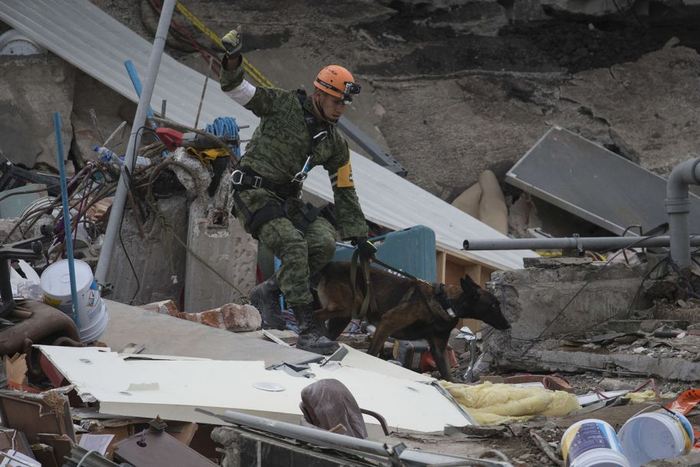 2017年9月22日,隶属墨西哥海军的救援犬Frida正和训练员Israel Arauz Salinas稍作休息,不久将继续搜寻Rebsamen小学的被困人员。