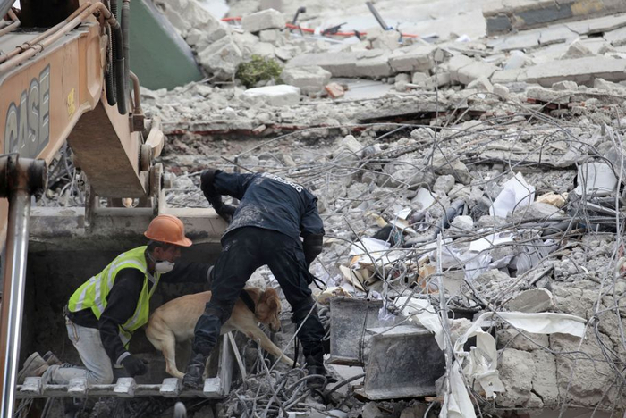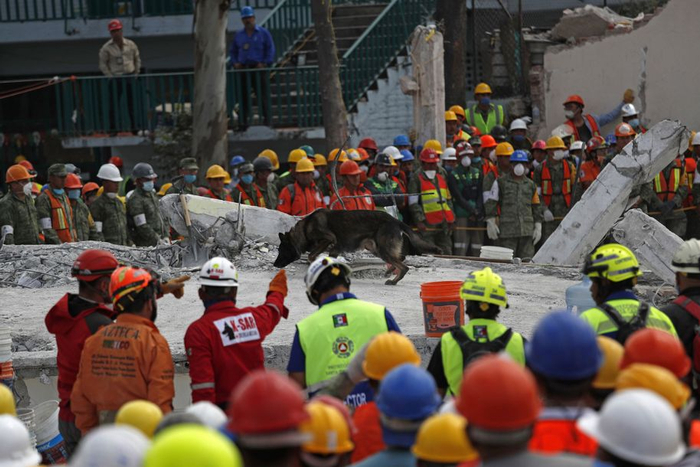2017年9月20日,墨西哥城,救援人员和嗅探犬一起搜寻被困在瓦砾碎石中的幸存者。这栋楼被这场里氏7.1级的地震震垮。