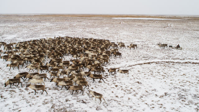 11月5日,在俄罗斯亚马尔-涅涅茨自治区,一名涅涅茨男子将鹿群赶往自己居住的方向。(新华社记者白雪骐摄)
