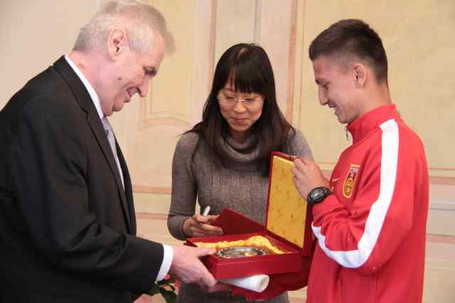 4月20日,中国国少队球员代表(右)向捷克总统泽曼赠送纪念品。(新华社发)两年后的今天,华信得到的回报已远远超出预期。如今的中国华信已是捷克家喻户晓的明星企业,帮助中国企业获得了捷克民众的欢迎和尊重。