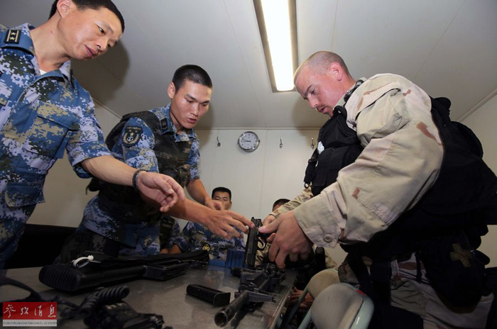 当地时间8月24日至25日,中国海军第十四批护航编队与同在亚丁湾海域执行任务的美国海军梅森号导弹驱逐舰举行中美海上联合反海盗演练。图为中美双方特战队员交流自身轻武器的特性。新华社记者饶饶摄